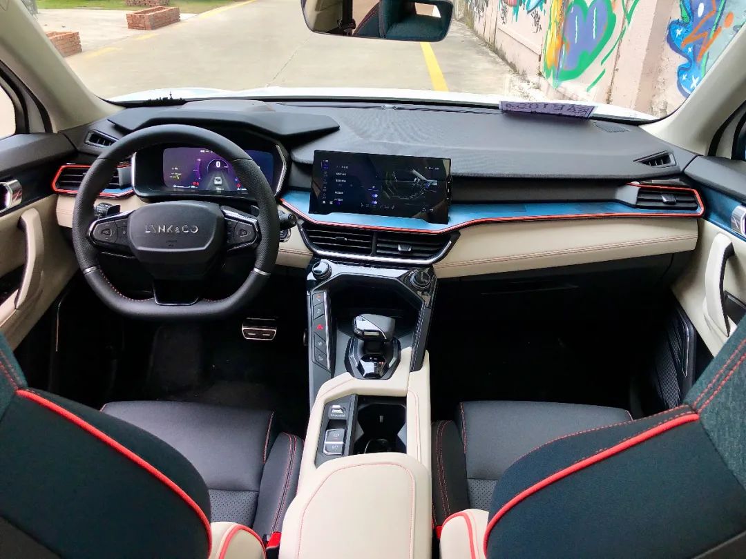 但领克06巧妙地采用深浅不一的丹宁色搭配白色,在一众传统内饰配色中,格外清爽不油腻,再加上赛车式座椅的造型,更是不失运动感。