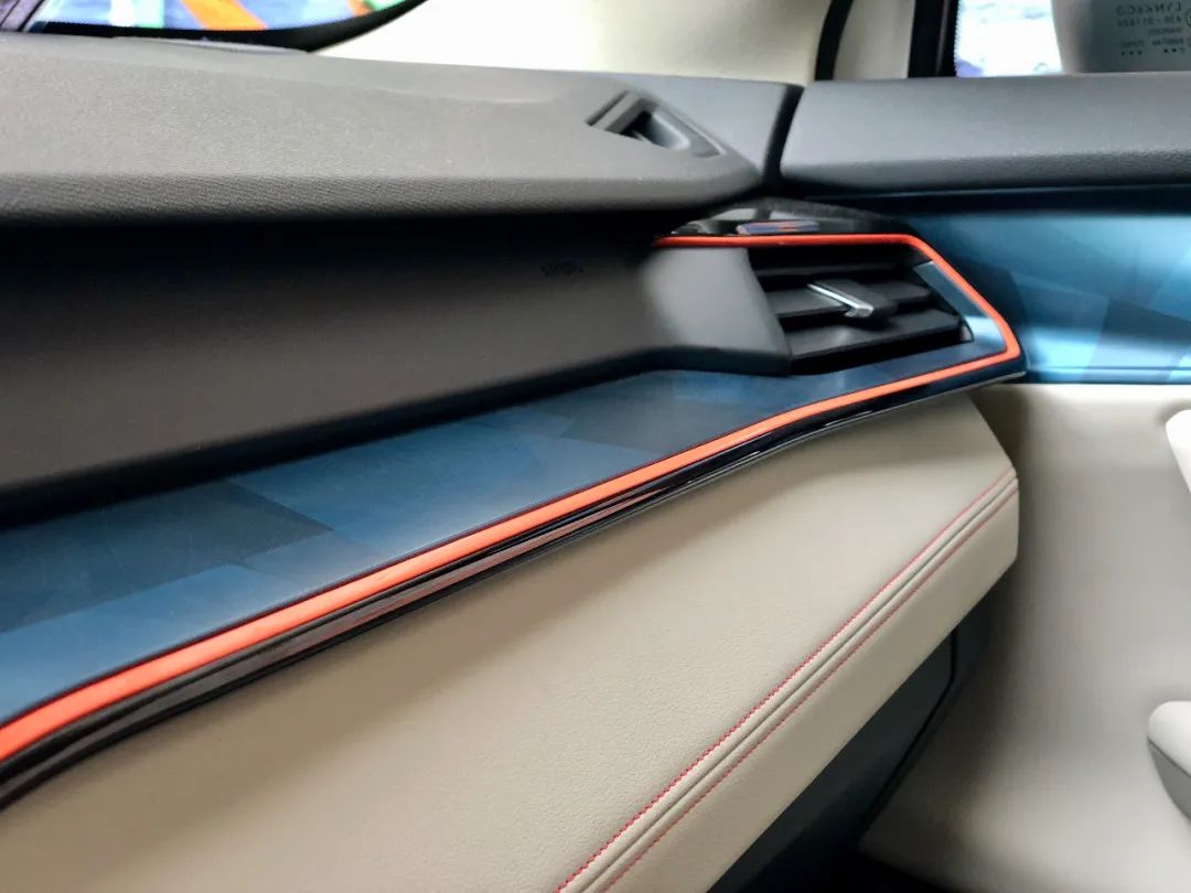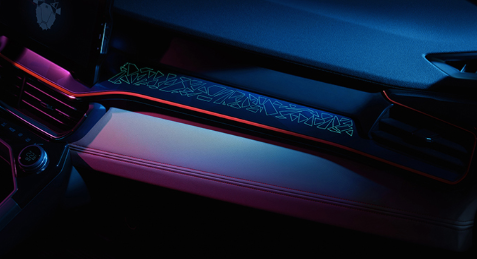 此外,副驾前面的饰板和门板处上,也别出心裁地加入了一些菱形几何元素,搭配可自定义多色的呼吸氛围灯效,未来感十足。