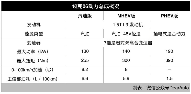 在领克06上,配备了三种不同的动力可选,分别是燃油版、MHEV版和PHEV版。