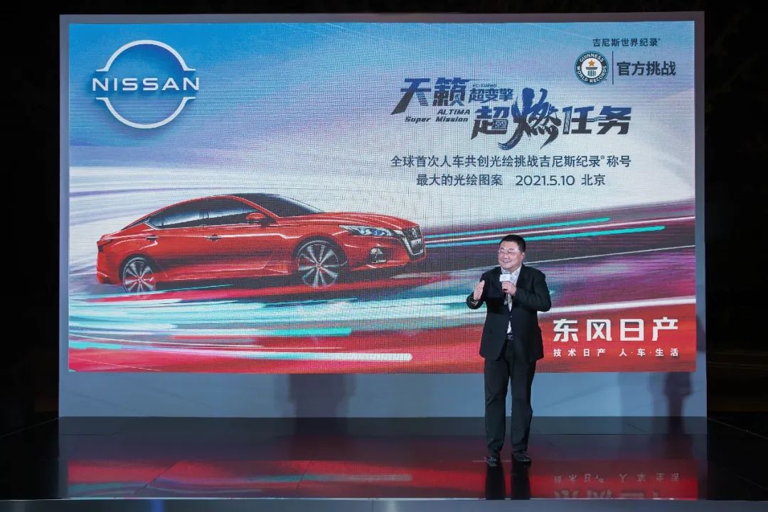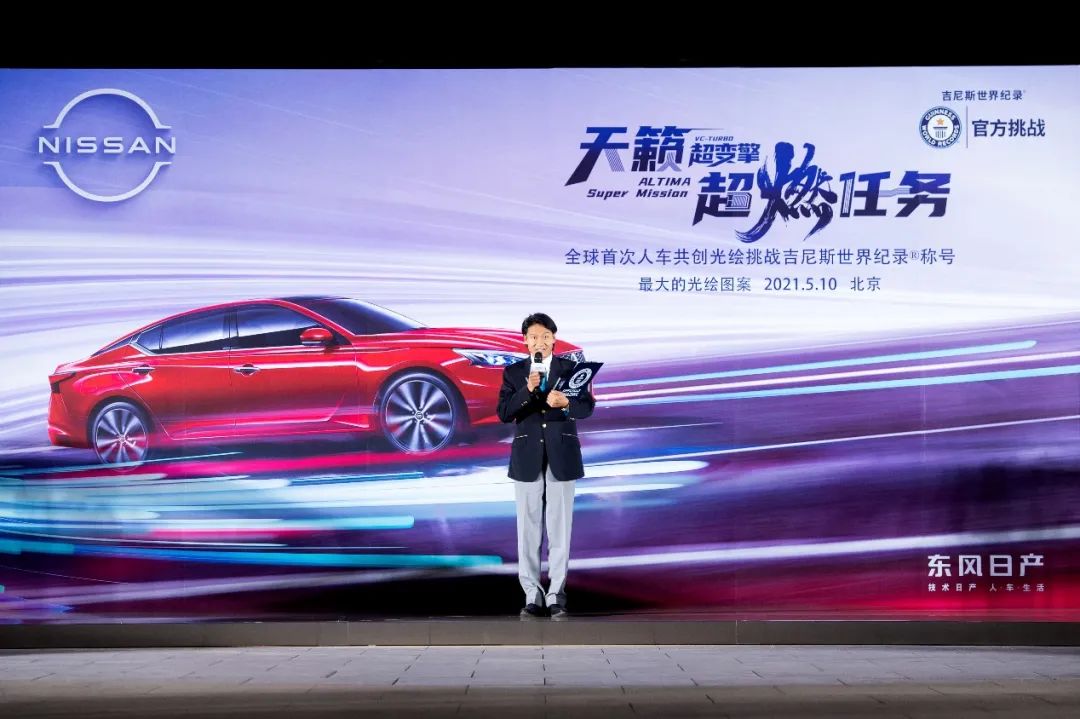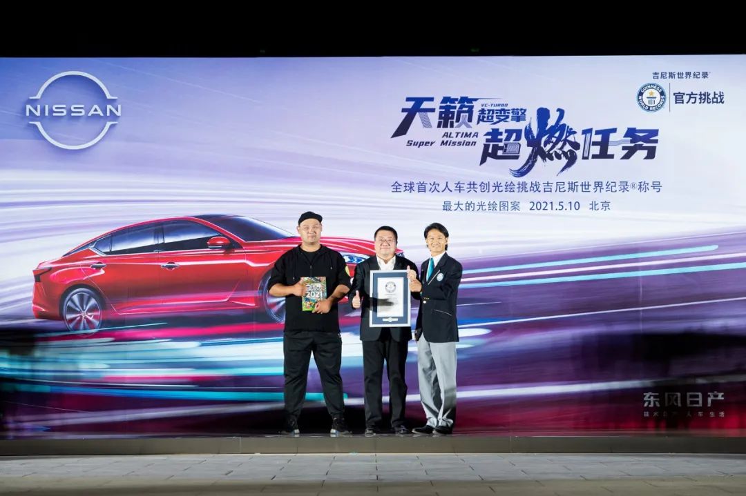 5月10日,天籁超变擎之超燃任务在北京雁栖湖上演,东风日产天籁携手中国光绘第一人Roywang,以全球首次人车共创形式,成功挑战2021㎡巨幅光绘作品《光之天籁》,创造了全球最大光绘吉尼斯世界纪录。