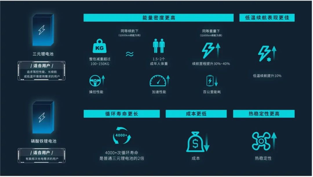 说白点,不管消费者选择哪种化学体系电池,都无须担忧电池的安全性,比如以价格为先的用户,重视电池的使用寿命,可以选择磷酸铁锂电池;而想要更高续航水平,主要使用环境是北方等严寒地区,那么就选三元锂电池。