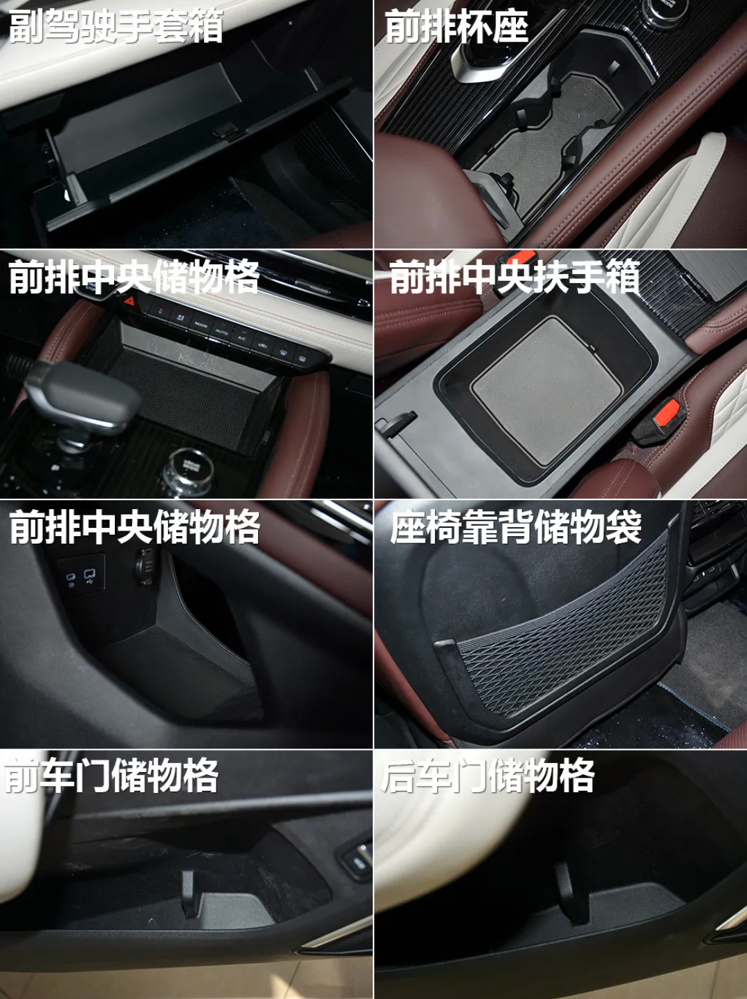 此外,前后排双杯座、前排中央上储物格、前后四车门储物格容量也很充裕,前排座椅靠背后还配有储物网袋。