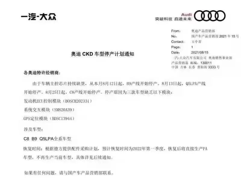 近日,一张“奥迪CKD车型停产计划通知”在网上广为流传,文中称因受芯片短缺的影响,一汽-大众奥迪A4L(B9)、Q5L(PA)和A6L(C8)等三款车型将相继停产,预计要到明年第一季度才能恢复。