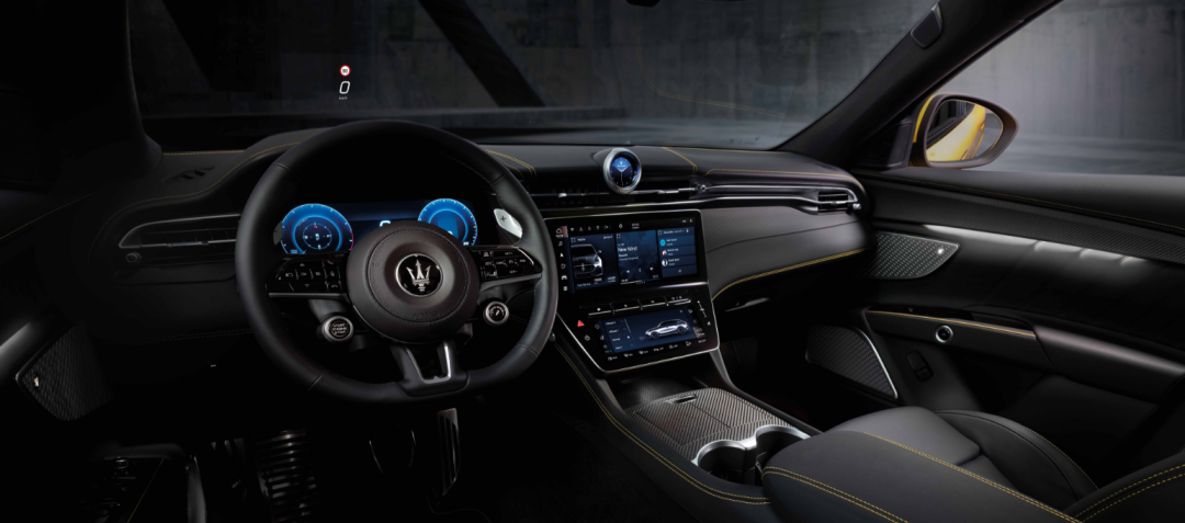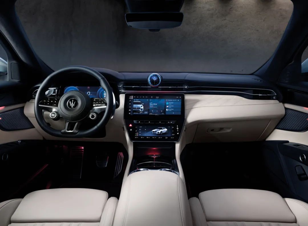 Grecale采用的是目前玛莎拉蒂科技感最强的一套内饰,总共有三块大屏组成,整体布局保留了传统燃油车的风格,中控屏幕内置与腾讯合作开发的车联系统,而对于中控双屏的设计,最早在14代丰田皇冠上所见过。