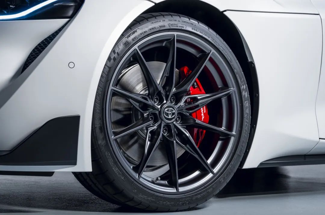 像Supra这类前置后驱的纯粹跑车很多时候都会采用鸳鸯胎的设定,根据官方资料显示,手动版的Supra前轮胎的尺寸为255/35 R19、后轮胎的尺寸为275/30 R19,同时全新设计的19英寸轮圈重量更轻,刚性更高,每个车轮减重1.2公斤。除此之外,新车还配备了Brembo制动卡钳。