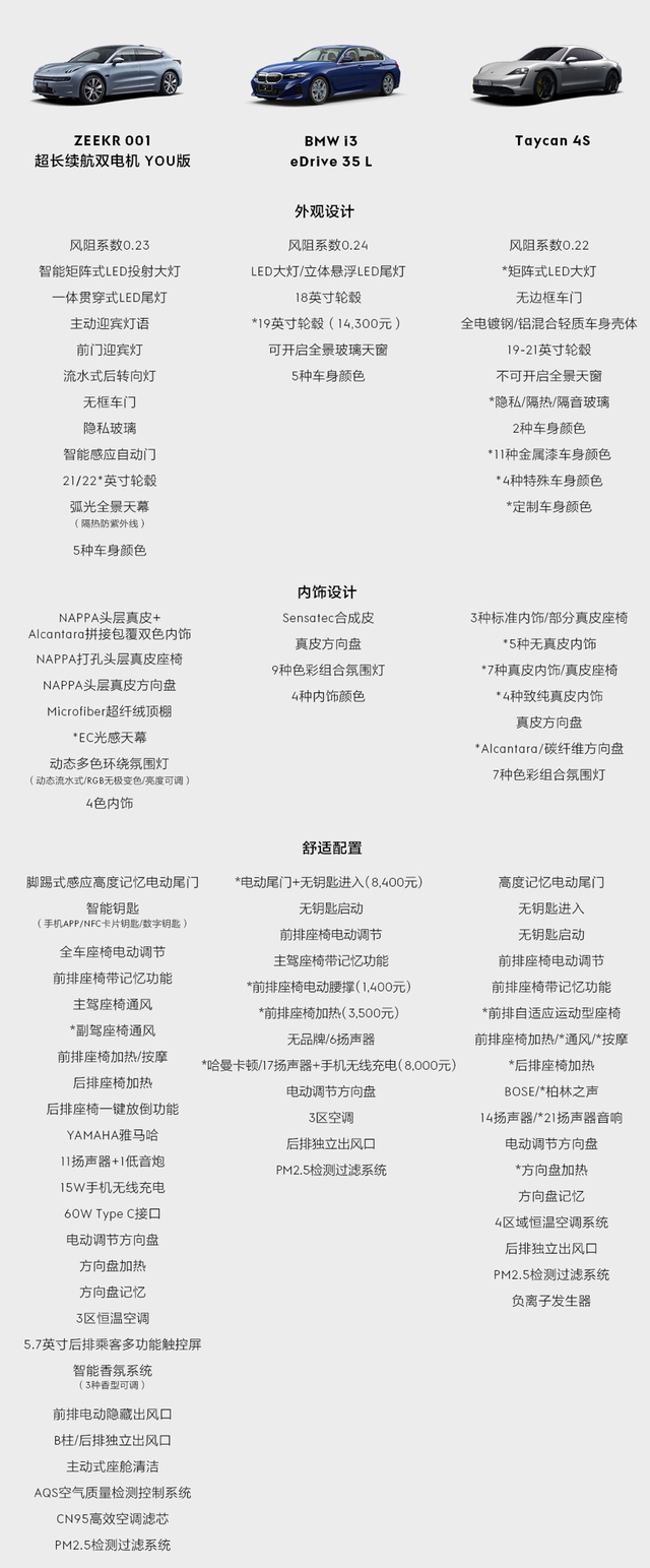 当打开宝马i3和Taycan 4S的配置表时,就会发现这些豪华品牌将“选配”玩的很不一般。比如Taycan 4S光车身颜色就可以推出15项“加钱项”,宝马i3一个19英寸轮毂就能花掉14,300元。