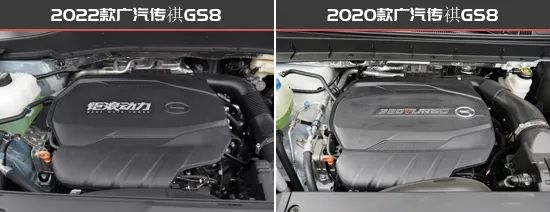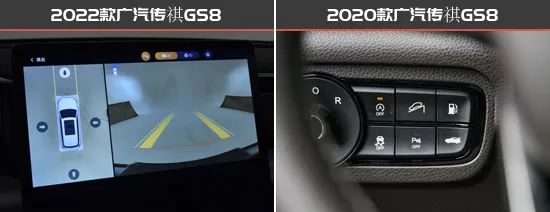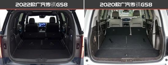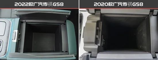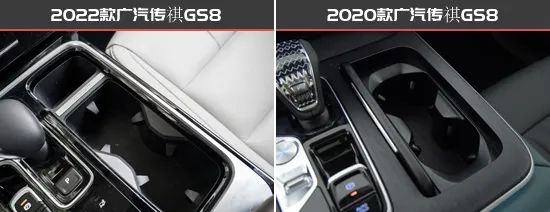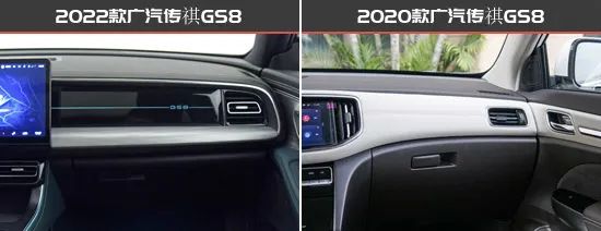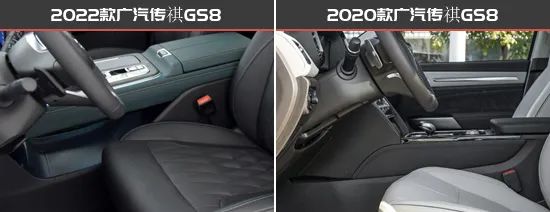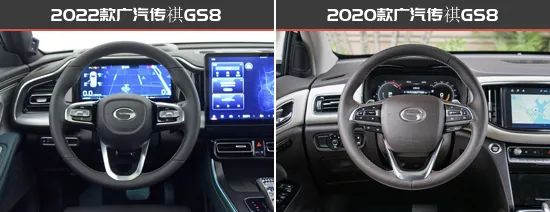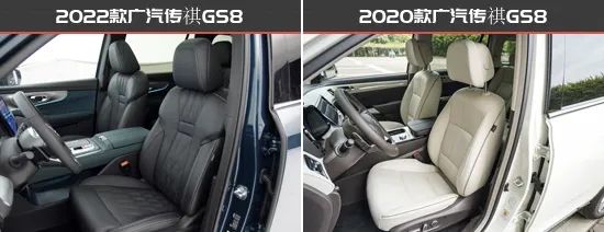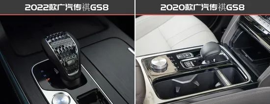 车辆内饰变化同样较大,可以明显感受到是两个不同时代的产物。全新一代传祺GS8与老款车型相比更加简约,设计风格更加符合当下潮流。老款车型中控台上的物理按键,在新款车型中也被融入到了中控屏内,同时大面积软质材料包裹的中控台在新款车型上还加入了钢琴烤漆饰板以及GS8铭牌,增加了档次感。新老款车型虽然都采用了三辐式多功能方向盘,但新款车型方向盘多功能按键布局有所改版,且还运用了钢琴烤漆材质点缀,视觉效果更加精致。