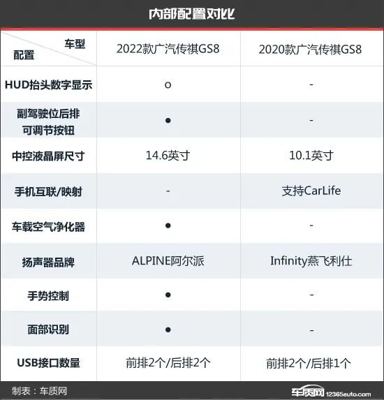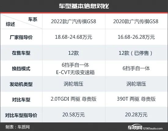 从信息表中我们可以看出,全新一代传祺GS8车型数量与老款车型保持一致,均为6款车型,但不同的是,老款中的5座车型在新款车型中改为了6座,实用性更强。从售价上来看,新款车型起售价比老款贵了2万元,但顶配车型却比老款车型便宜了1.6万元。而在动力方面,全新一代传祺GS8在高配车型上搭载了丰田混动技术,自身技术实力和性价比进一步得到提升。在本次对比中,我们选取了两款尊贵版车型进行对比,由于售价差别不大,我们更能看出在配置上的变化。