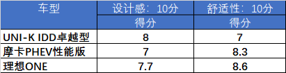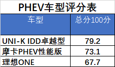 三台车中,得分最高的竟然是长安UNI-K iDD!理想ONE排名垫底!这个成绩说意外其实也不意外,意外的是市场知名度不高的UNI-K iDD居然综合成绩会排名第一,性价比真的太高了!不意外的是理想ONE成绩最低,除开市场定位准确外,理想ONE的产品力并没有与价格相称;摩卡PHEV主要还是太注重性能指标了,这样成本高价格也低不了,综合成绩就位居中游。