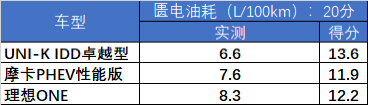 摩卡DHT-PHEV在行驶29.9km以后平均油耗为7.6L/100km,相比官方平均油耗6.3L/100km来说增加了21%,并且它比油耗最低的UNI-K iDD油耗高了1L/100km,因此要先减去油耗平衡分5分/1L,再减去官方与实测的差额占比,最终的成绩是11.9分。