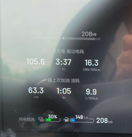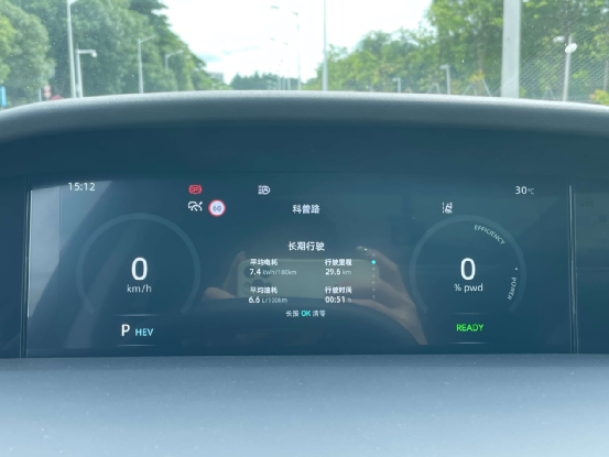 这部分我们主要测试官方标称续航里程与实际续航里程的差距。这三台车都有着超过100km的NEDC纯电续航里程,但大部分PHEV车型出于保护机制,纯电模式一般都不会将电量完全耗光,所以也没办法做光电测试。我们选取了消耗SOC表显电量60%-30%之间的电量来测试实际行驶里程,在广州大学城外环线模拟日常行驶,通过这30%的电量实际行驶里程也很容易计算出整体的续航里程。