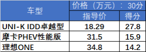 价格分没有意外,也基本跟这三台车的售价成正比。UNI-K iDD 1.5T卓越型之所以比对照车型唐DM-i尊贵型有着更高的分数,是因为UNI-K iDD跟唐DM-i的尺寸几乎一致,但UNI-K iDD在价格更低、性能更好的同时,还有着更远的纯电续航里程,这些导致了它拿到了高分;而摩卡DHT-PHEV性能版与理想ONE的售价都超过了30万导致分数不佳。