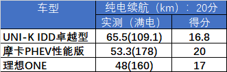 在实际行驶的时候,由于UNI-K iDD行驶时不能实时显示SOC百分比,好在它的纯电模式可以一直开到没有电,所以直接跑到纯电续航为1km,60%的剩余电量行驶了65.5公里,折合满电可以行驶109.1km,达到官方标称130km纯电续航里程的84%,相应的分数16.8分;