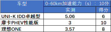 我们也做了个简单的0-60km/h加速测试,三台车由于动力相差还挺大的,所以没有什么悬念,综合平均分后三台车的成绩如下: