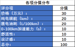 以目前中型插混SUV销量标杆唐DM-i尊贵型(20.58万元)为参照物,如果总分100分它可以打80分的话,那么唐DM-i尊贵型在这个表内的价格分可以打24分。考虑到车辆尺寸(座椅布局)、前后电机、电池大小以及智能辅助驾驶等配置成本的增减,编辑们最终打出来的价格分平均后如下: