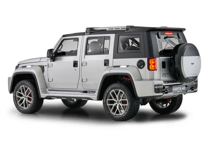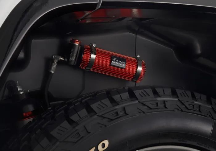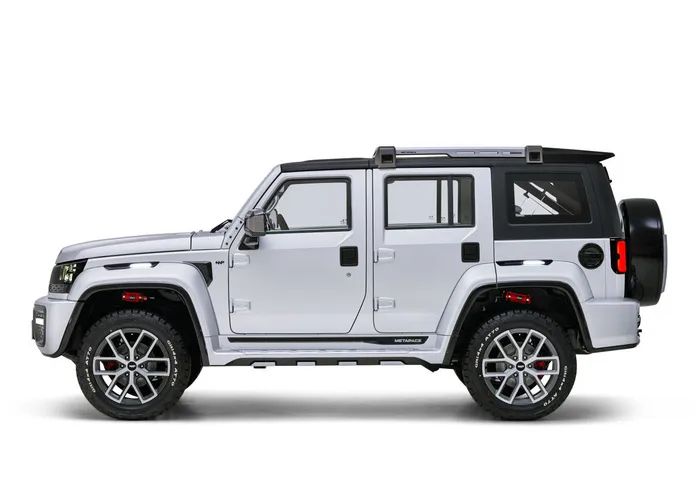 侧面能看到新车换装了全新样式的行李架,同时还配备了固定式金属踏板,并在车门下方印有METAPACE标识。新车在轮眉位置加入了越野装饰,同时换装了佳通的AT越野轮胎,以及K-MAN氮气减振器,并对车辆进行了升高处理,使得其越野性能相比普通版的BJ40提升许多。
