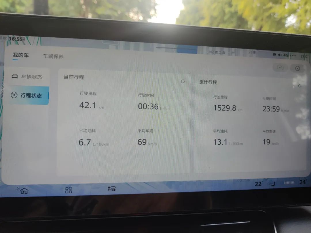 车流量不算大,平均车速69km/h,行驶里程42.1km,开着空调,录得平均油耗6.7L/100km(仅供参考)。