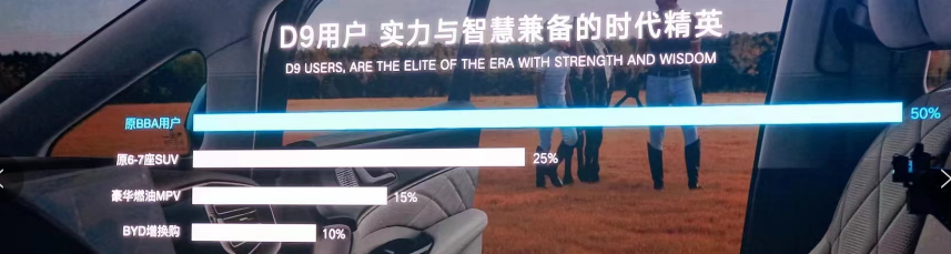 让大家有点意外的是,在腾势D9 超过5万名的用户的大定用户中,50%都是BBA车主投奔而来,还有15%的豪华MPV买家改弦易帜,其中有部分是丰田埃尔法客户。也就是说,腾势D9约2/3的用户由豪华品牌转变而来。