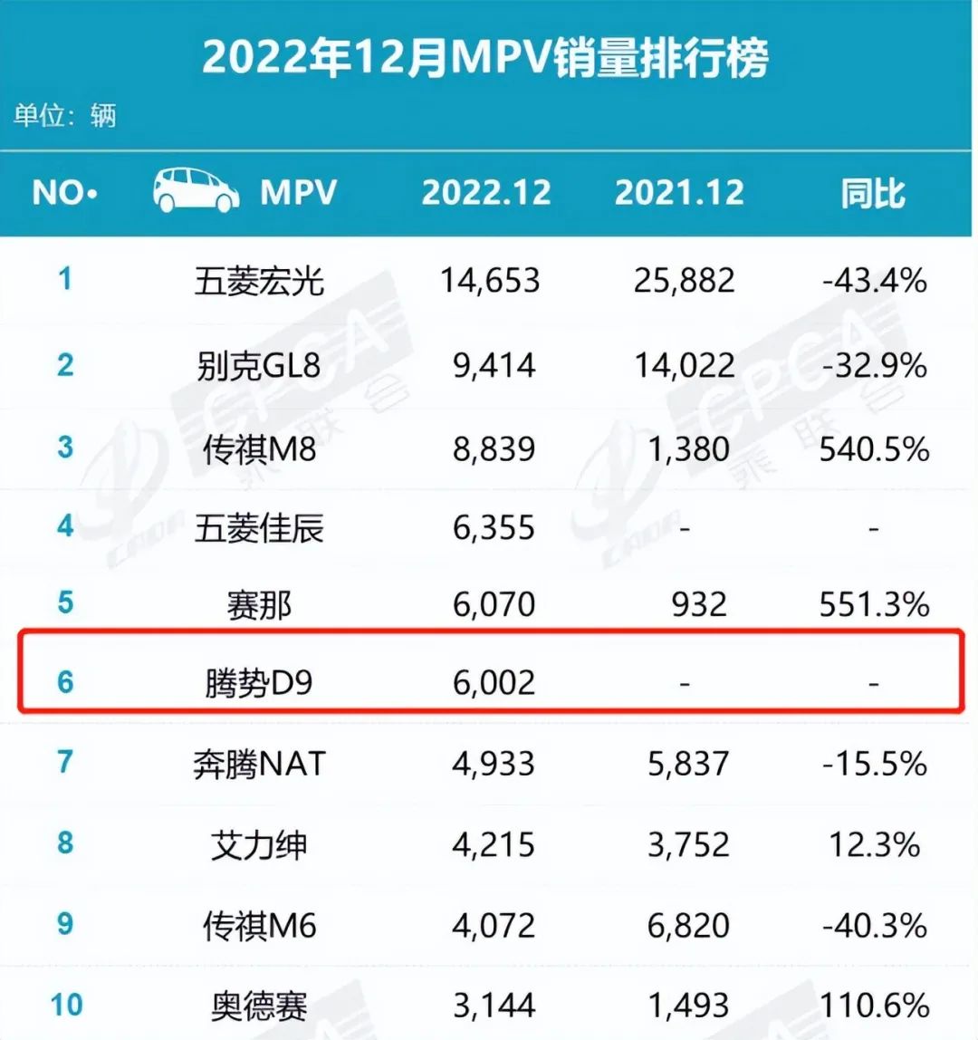 根据乘联会的数据,腾势D9在2022年12月份已经位居高端MPV的前三,与赛那不相上下,更是新能源版本的NO.1。