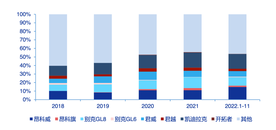 据中汽协数据显示,以昂科威、昂科旗、GL8、GL6、君威、君越、凯迪拉克系列、开拓者为中高端车型代表,销量占比由 2018 年的 39.7%提升至 2022 年的 53.7%。