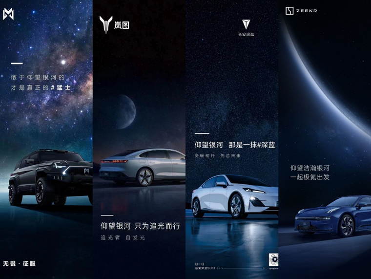 在“吉利银河”系列发布当天,瞬间引发了汽车业的集体“狂欢”。各大中国品牌纷纷推出海报互相致敬,“银河”带动中国品牌集体向上的号召力和影响力可见一斑。