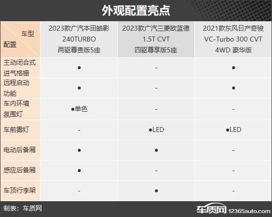 三款对比车型均为中配车型,在外观配置方面各有千秋。本田皓影的外观配置较为全面,除了LED前雾灯和车顶行李架以外,其它基本该有的都有了。相比之下,三菱欧蓝德和日产奇骏的表现略逊一筹,前者拥有电动后备厢和车顶行李架,后者则配有主动闭合式进气格栅和远程启动功能,可见二者在配置上有着不同的取向。