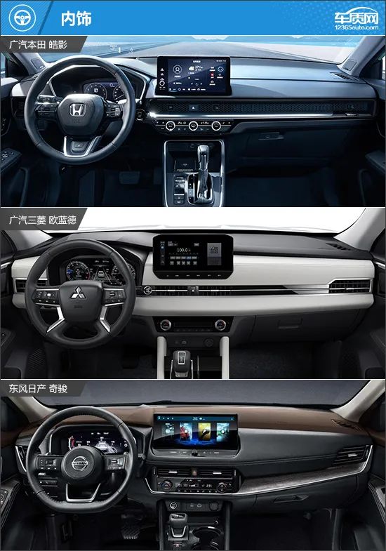 在内饰设计方面,不知道是否因为都是日系车的缘故,三款车型在内饰的设计和布局方面,有着或多或少的相似之处,不约而同地采用了嵌入式液晶仪表、悬浮式中控屏,横向延伸的中控台以及相对常规的地台设计。虽然样式布局大同小异,但风格上还是有一定区别的,本田皓影的设计看起来更偏向年轻运动风格,而三菱欧蓝德和日产奇骏的样式则更偏向稳重和豪华的调性。