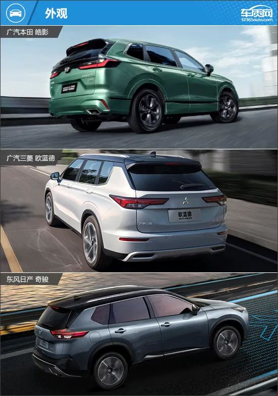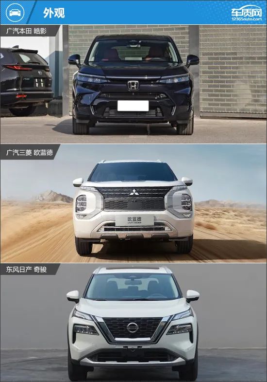 对于这三款车来说,它们都有着各自品牌的设计特色。本田皓影的设计相对保守,以沉稳大气的风格为主基调。相比之下,三菱欧蓝德和日产奇骏的设计在视觉上显得更加激进夸张,可能是因为与众不同的格栅造型以及分体式头灯设计的缘故吧。