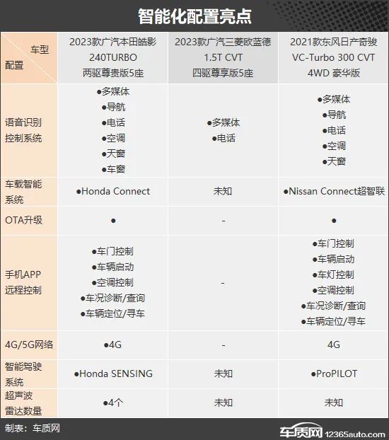 我们再来看智能化配置,通过表格可以看出,本田皓影、日产奇骏分别搭载了本田、日产品牌各自的车载智能系统和智能驾驶系统,在语音识别以及手机APP远程控制等各个方面都表现优异。而三款对比车型之中在智能化配置方面最薄弱的则为三菱欧蓝德,除了可以语音控制多媒体和电话之外,其它配置项目基本都没有涉及。