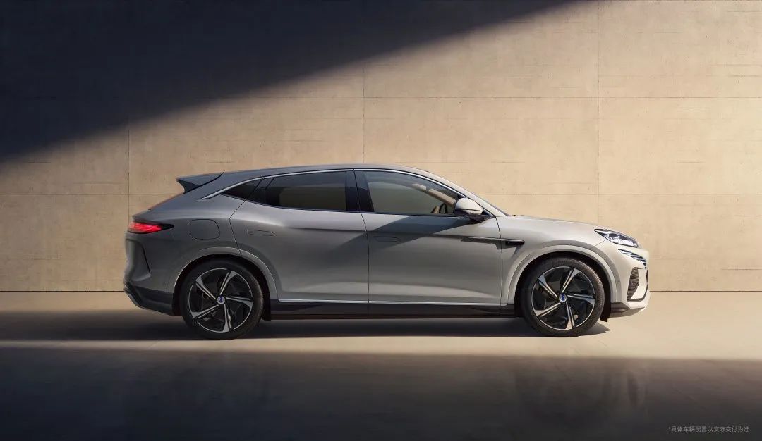 来到侧面,可以看到腾势N7采用了长轴距、短前悬的设计,并且车身的姿态也较为低趴,从而营造了不错的运动感。