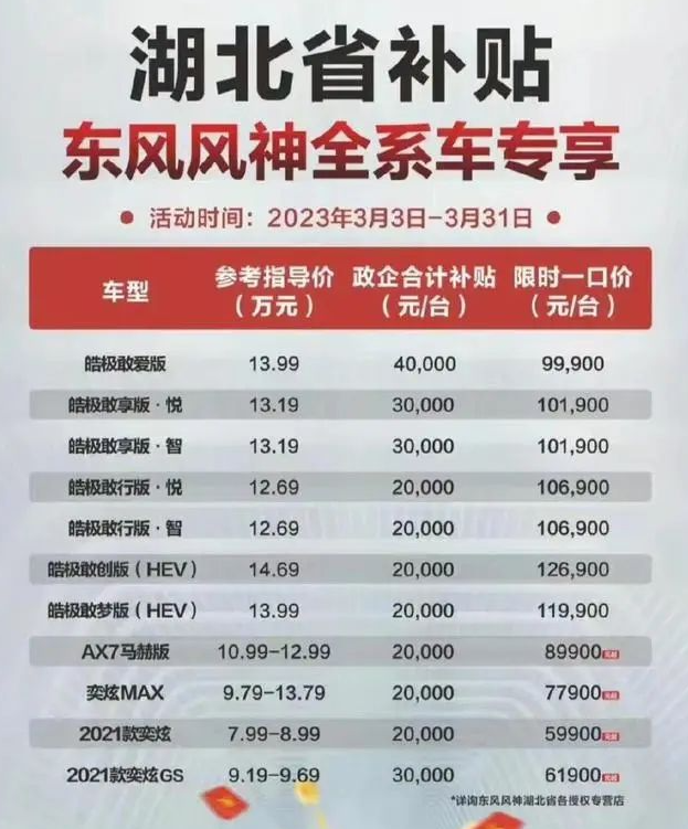 近日,湖北省政府联合东风汽车集团,进行限时政企双补贴购车促销政策。补贴范围涵盖了东风日产、东风本田、东风标致、东风雪铁龙、东风风神等众多品牌,部分合资品牌的车型突破了历史最低售价,这都体现了本次补贴的范围之广、力度之大。