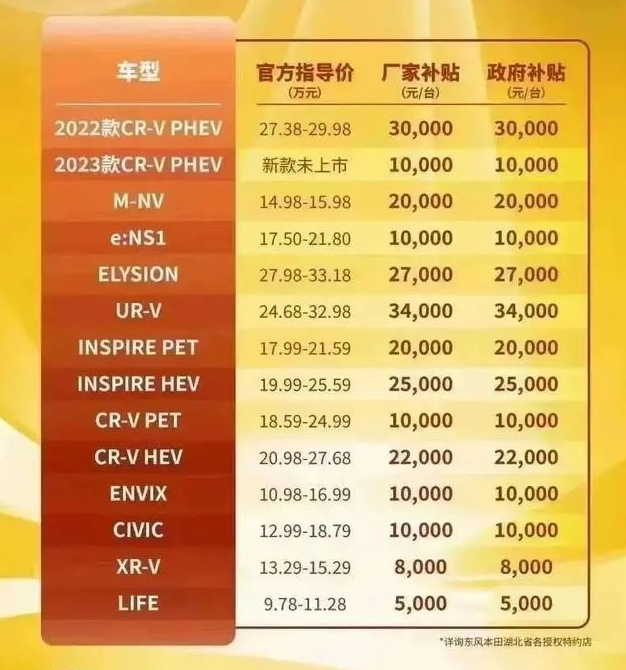 从东风本田的海报上看,优惠大几万的车型不在少数,但仔细算算账,却未必是那么回事。以2022款CR-V PHEV为例,指导价27.38-29.98万元,政府补贴3万,厂家补贴3万,一共是6万元,听起来很划算?实际上,这台车在广州的终端现金优惠已经达到8万元,比湖北的优惠幅度更大。另外,像XR-V优惠1.6万元、来福酱优惠1万元、思域优惠2万元,其实和4S店平常的现金优惠幅度接近。