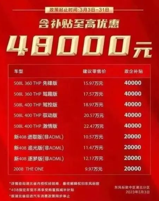同为法系的东风标致,虽然优惠幅度未能看齐雪铁龙,但其参与优惠的主要车型为508L和新408。此二者均为东风标致的销量主力,最大优惠幅度达到4万元,也体现了东风标致的诚意。