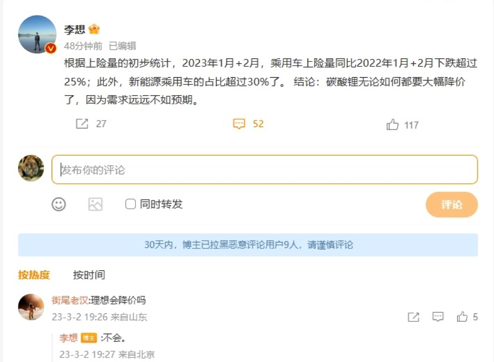 早在社交媒体上,理想CEO李想就表明理想不会进行降价,他认为:“如果理想把中型车卖到30多万元会卖不出去,那把中大型SUV卖到20多万元,理想也一样卖不出去。”