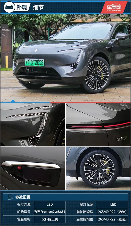 在前保险杠以及两侧翼子板处,还配有激光雷达,为驾驶辅助提供了必要帮助。试驾车型选装了马牌 PremiumContact 6系列,该系列轮胎舒适与操控兼备,其规格为265/40 R22。