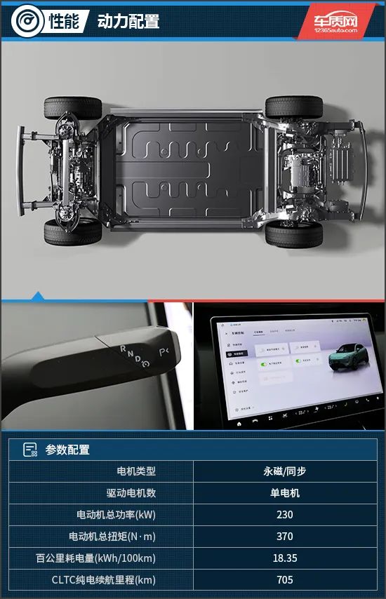 试驾车型搭载了永磁/同步电机,电动机总功率为230kW,总扭矩为370N·m。此外,试驾车型搭载了宁德时代三元锂电池,CLTC纯电续航里程为705km。