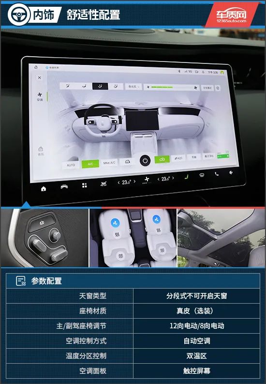 在舒适性配置方面,阿维塔11也展现出较高的水准。试驾车型选装了真皮座椅,前排座椅还支持通风、加热以及按摩功能,舒适度毋庸置疑。另外,试驾车型还配备了分段式不可开启天窗,天窗整体面积较大,车内采光效果良好。为了保证车内空气质量,该车还搭载了车载空气净化器、车内PM2.5过滤装置。