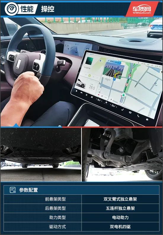 阿维塔11的方向盘握感比较舒适,驾驶时的虚位很小,并且随着车速增加,方向盘也会变得沉重一些。得益于前双叉臂式独立悬架、后五连杆独立悬架,整个试驾过程中,车内舒适度非常出色,路面上出现的细小振动悬架系统会完全化解。而在面对减速带等较大冲击时,悬架又可以将其处理得十分柔和。
