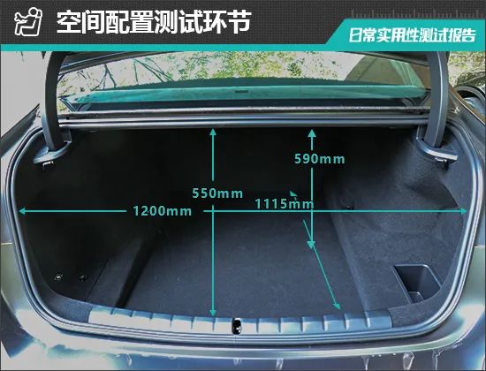 测试车型的后备厢开口较大且纵深让人满意,在右侧还设计有储物格用于放置零碎物品,整体储物能力出色。对于测试车型后备厢的基础数值,我们也进行了实测,开口宽度为1200mm;开口长度为550mm;后备厢进深为1115mm;后备厢地台与内部车顶的垂直高度为590mm。