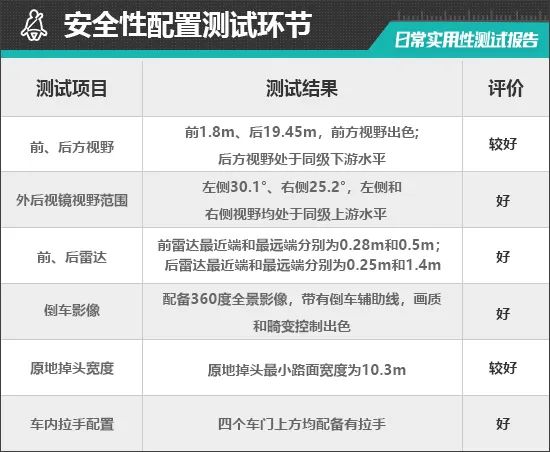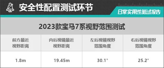 在车辆前、后方视野测试中,车内所有座椅均已调整至最低状态,所测出的数据与驾驶者正常使用时均有一些偏差,仅供参考。