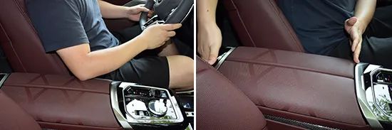 测试车型前排中央扶手箱的面积宽大,且表面采用软性皮质包裹,触感柔软。虽然不支持前后移动和角度调节,但是在驾驶员保持正常坐姿的情况下,能够给予手肘足够的支撑,实用性表现不错。