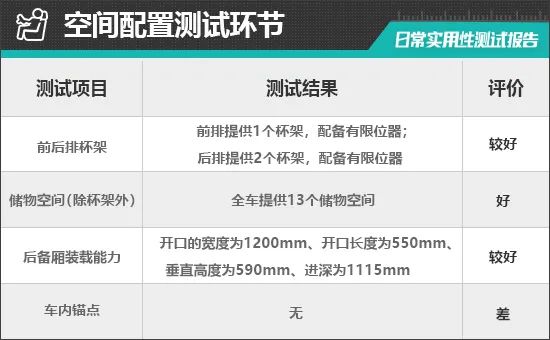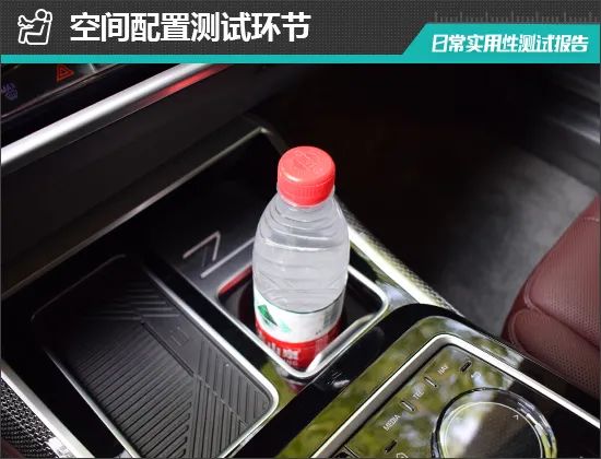 对于车内使用空间的测试,只针对前排触手可及的空间,不包括手套箱、中央扶手箱等需要开启的空间。测试方法是将以下固定物品全部放置在前排的各个储物空间内,通过固定物品的放置情况来判断车辆储物空间的表现。测试选定的固定物品为:2瓶常规大小的矿泉水、1部大屏手机、1支口红、1个挎包、1副墨镜、1把折叠雨伞以及1包常规尺寸的抽纸。
