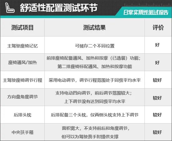 在主驾驶座椅测试中,测试车型的驾驶座椅最前端和最末端之间的距离为290mm,较老款车型有所进步,座椅可调节行程在测试过的同级别车型中处于平均水平,能适应不同身材乘客的坐姿。