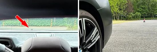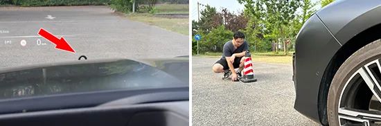 在测试前方视野环节,我们采用高70cm的桩桶作为参照物,随后调整车距,直至在主驾驶位可以看到桩桶上沿。经过测试,桩桶与车头最终测得的数据为1.8m,不仅相比老款车型有明显进步,且在测试过的同级别车型中也处于上游水平,车头视野开阔。