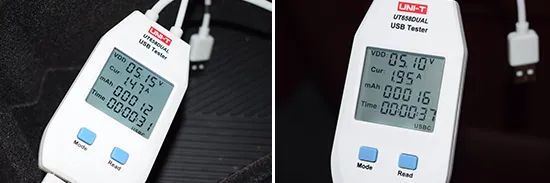 此外,我们也对USB接口的电压与电流进行了测试。前排和后排接口的电压都能达到5V左右,不过后排接口的电流要高于后排,能接近2A,充电功率显然要高于前排USB接口。另外,测试车型前排手套箱内配备有一个12V电源接口。