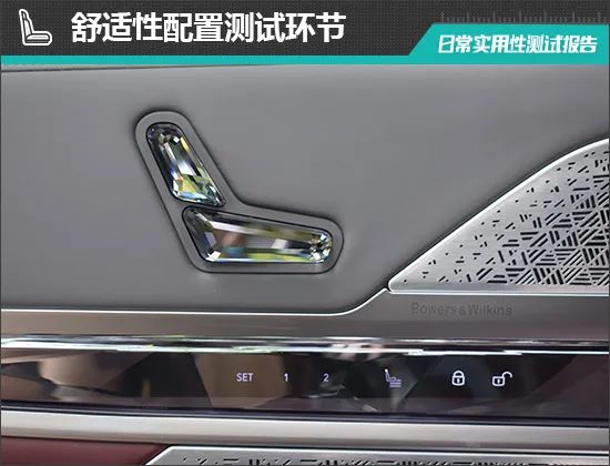 座椅方面,测试车型前排座椅支持二档座椅记忆,并且皆配备有通风、加热和按摩(已选装)功能。第二排座椅标配了通风、加热和按摩功能,舒适性直接拉满。无论冬日或夏季,都能提供舒爽的驾乘体验。