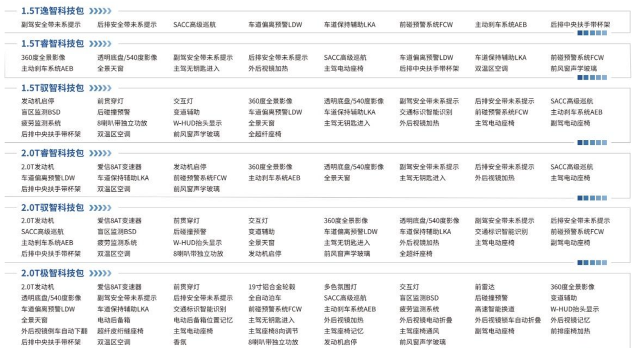 对于动力有较高要求的朋友,建议选择2.0T科技包,并且2.0T科技包相比1.5T科技包,也是从睿智科技包开始的,起点更高。2.0T睿智科技包同样是在逸智科技包的基础上增加了发动机启停、自适应巡航、前碰撞预警系统FCW 、主动刹车系统AEB、车道偏离预警LDW、车道保持辅助LKA、副驾安全带未系提示、后排安全带未系提示、后排中央扶手带杯架、360度全景影像、透明底盘/540度影像、全景天窗、主驾无钥匙进入、外后视镜加热、主驾电动座椅、双温区空调、前风窗声学玻璃。同样是非常具有性价比的选择,配置够用,动力更强。