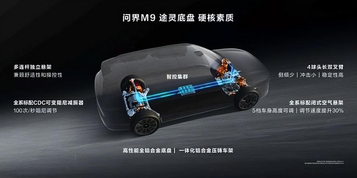 首先搭载猫头鹰增强转向技术,转弯半径仅为 5.8 米,跟一些紧凑型车差不多这一点是好开的基础。更重要的是搭载途灵智能底盘,采用前双叉臂+后多连杆独立悬架,全系标配智能闭式空簧和CDC可变阻尼减震器。另外还有道路预瞄系统,底盘软硬智慧调节;HUAWEI DATS动态自适应扭矩系统和HUAWEI xMotion智能车身协同控制系统,用AI与软件能力将机械素质发挥到极致,提升车辆续航、舒适、操控、稳定等性能,让问界M9拥有大车好开、更安全、舒适的驾乘体验。
