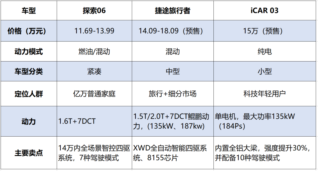 一直和越野圈子保持平行的奇瑞集团,旗下四大品牌的三个,就发布不同动力系统的“轻越野SUV”,包括奇瑞探索06、捷途旅行家和iCAR 03等,大有在哈弗二代大狗、哈弗猛龙中“虎口觅食”之意。而作为“野蛮人 ”强攻的第一炮,探索06被奇瑞寄予很高期望,不仅为新车请来明星代言,还打出“科技平权”的大牌,“1.6T+四驱”打到了14万以下。就在一大波营销攻势和不错定价策略,奇瑞探索06确实也不负使命,在8月打出不错的关注度。