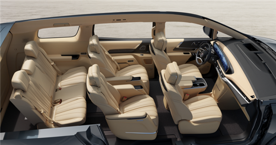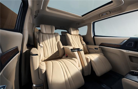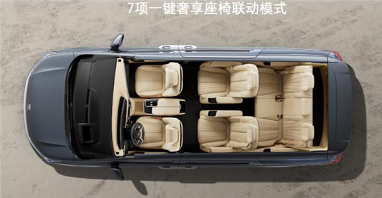 舒适性方面,新车采用“2+2+3”座椅布局,搭载二三排共用纵向电动长滑轨设计,可以让二/三排座椅分别实现长行程的电动前后移动。其第二排配备高级打孔真皮航空座椅,支持14向全电动调节、椅背最大可调节至171度、3档加热/通风/位置记忆、10点式按摩功能,并囊括一体展开式电动腿托和电动无级调节脚踏、翻折小桌板、无线充电手机槽,内侧扶手集成的滑动式6英寸智能触控屏还可对座椅、车窗、后排天窗遮阳帘、空调进行控制。